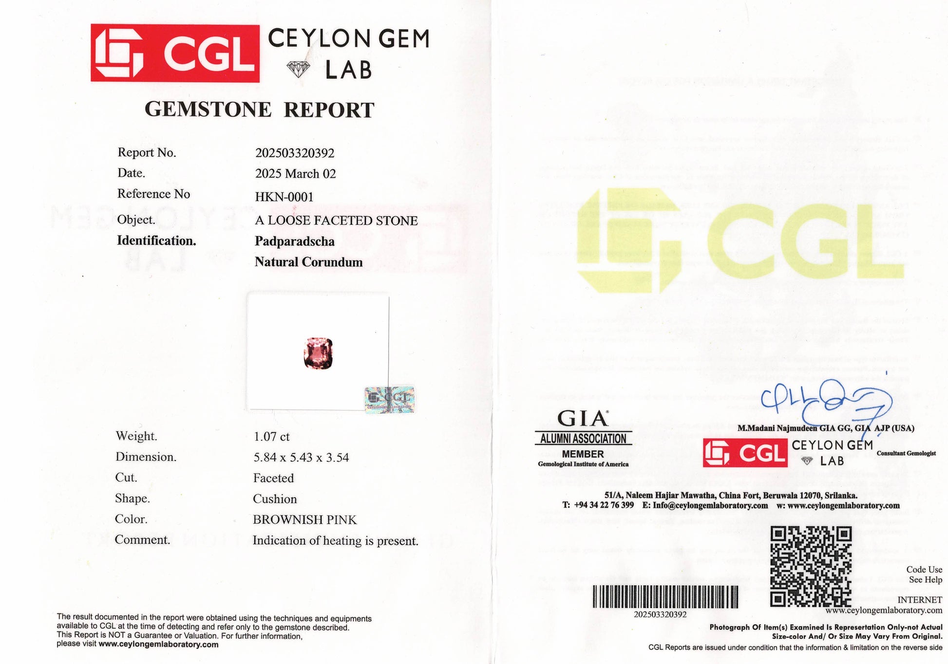 Mined from deep within the earth, then lovingly hand-faceted into a sparkling cushion cut to reveal its exquisite hidden brilliance, let this 1.07ct Padparadscha Sapphire from Sri Lanka be your moment-defining treasure.