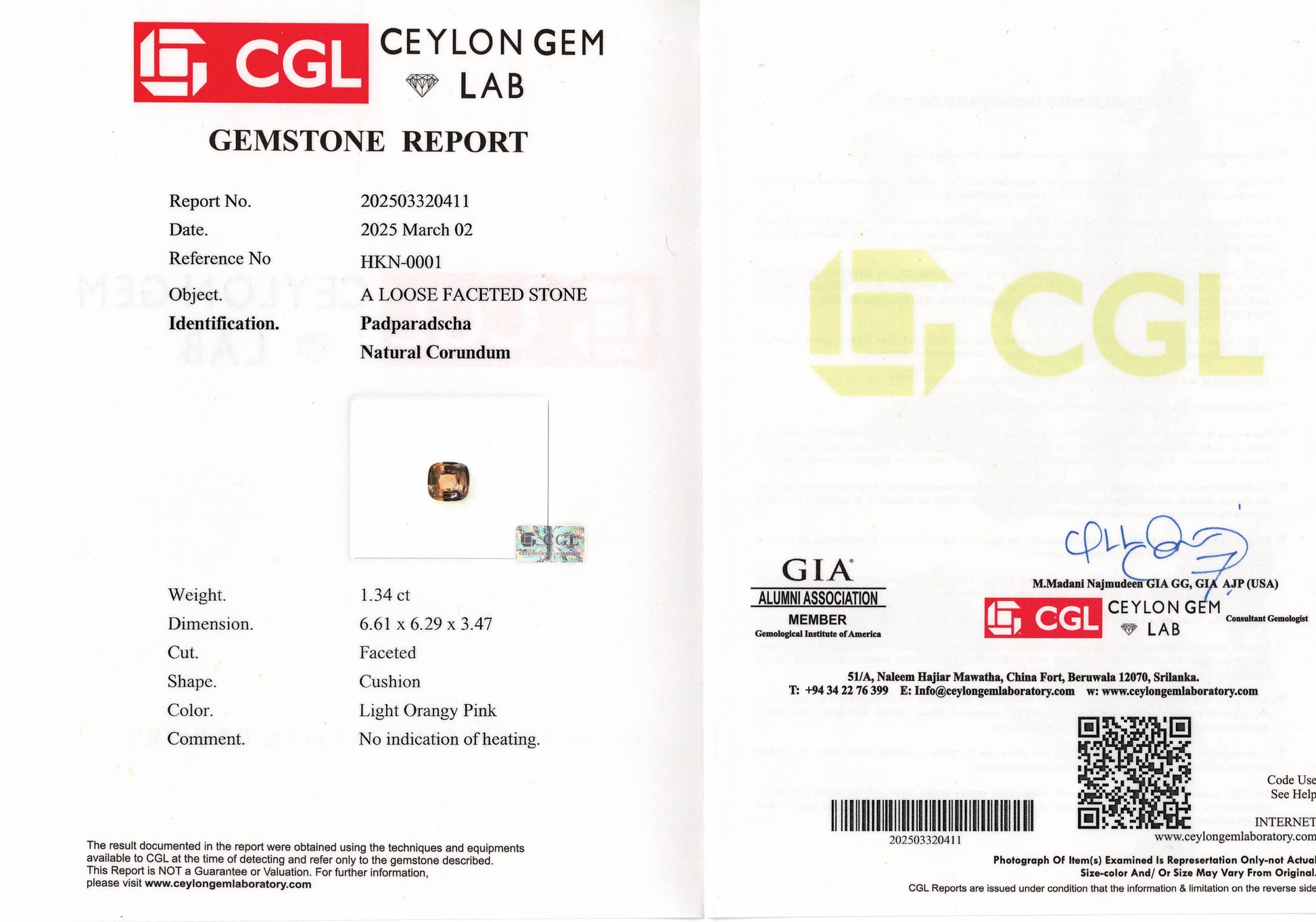 Mined from deep within the earth, then lovingly hand-faceted into a sparkling cushion cut to reveal its exquisite hidden brilliance, let this 1.34ct Padparadscha Sapphire from Sri Lanka be your moment-defining treasure.
